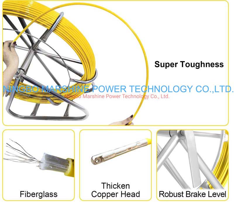 De Marshine FRP Fish Tape Fiberglass Traceerable Duct Rodder is gemaakt van de glasvezelversterkte plastic (FRP) kern, die de hoge tetensterkte kan bieden en tegelijkertijd de flexibiliteit kan waarborgen zonder te knikken of te breken in de strakke bochten. Met een drievoudige Layer FRP-constructie kan dit gereedschap de mechanische stress, chemicaliën en de milieuslijtage weerstaan, kan een levensduur van 10+ jaar zorgen.